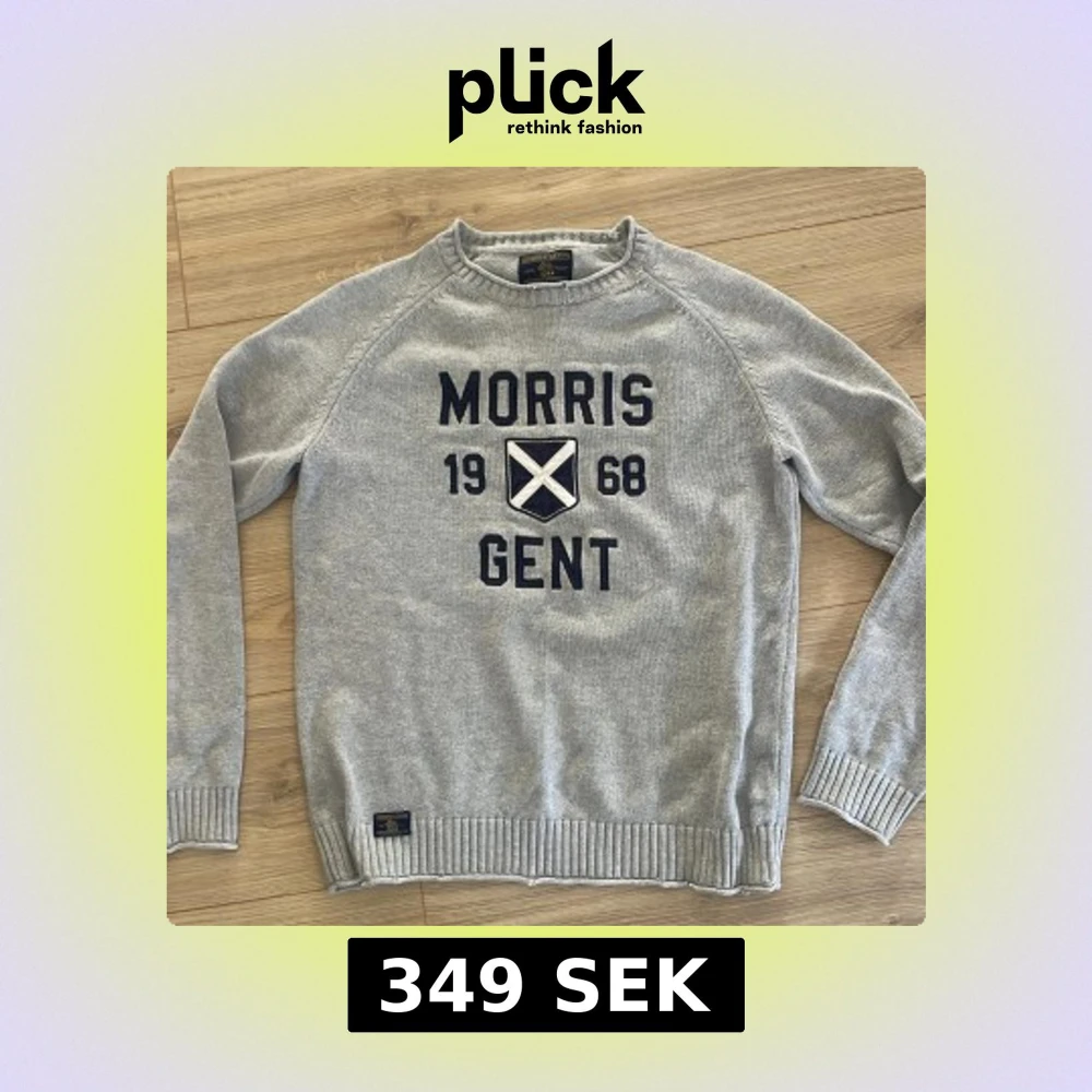 Säljer en grå stickad tröja från Morris Gents med broderad text och emblem framtill. Tröjan har långa ärmar, rund hals och ribbade muddar vid ärmslut och nederkant. Perfekt för en stilren och avslappnad look.