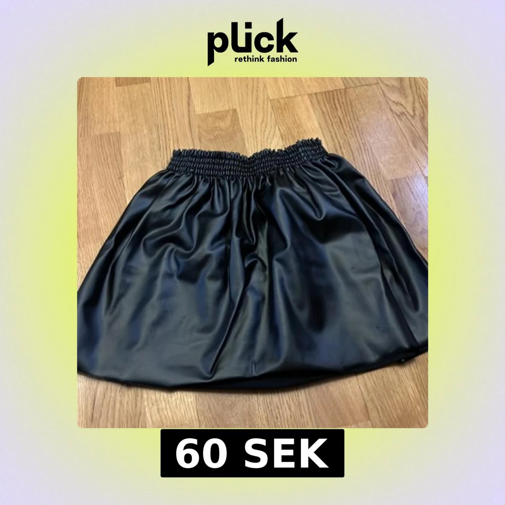 Snygg svart kort kjol från H&M i glansig skinnimitation med bred resår i midjan. Kjolen har en lätt utställd form och är perfekt för dig som gillar en edgy look. Enkel att matcha med både t-shirt och stickad tröja.