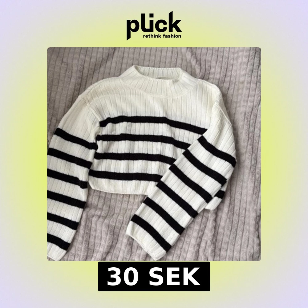 Säljer en croppad stickad tröja från H&M i vitt med svarta horisontella ränder. Tröjan har ribbad struktur, lång ärm och rund halsringning. Perfekt för lager-på-lager och chill stil.