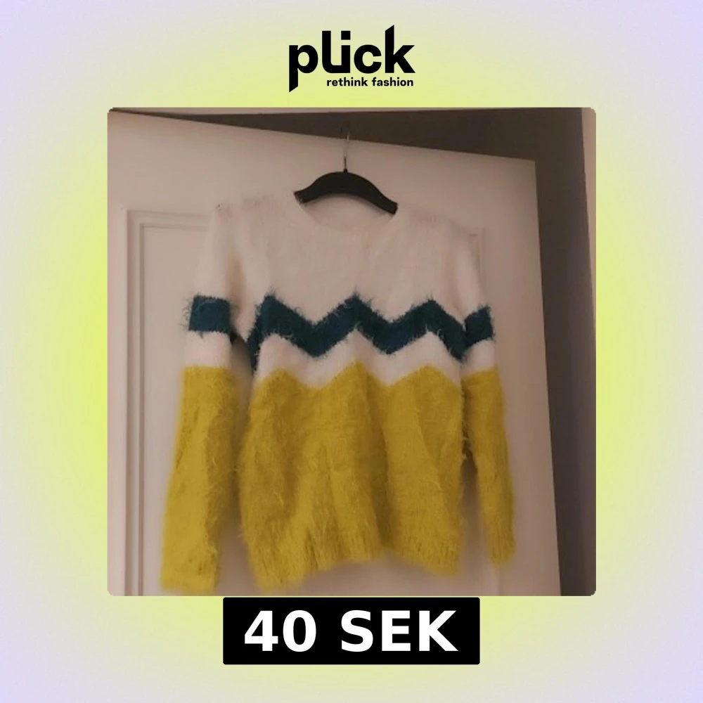 Säljer en mysig och fluffig stickad tröja till flicka från H&M i vitt, blått och gult med ett zigzag-mönster. Tröjan har långa ärmar och är perfekt för att hålla sig varm under kyliga dagar. Den är både stilren och bekväm.
