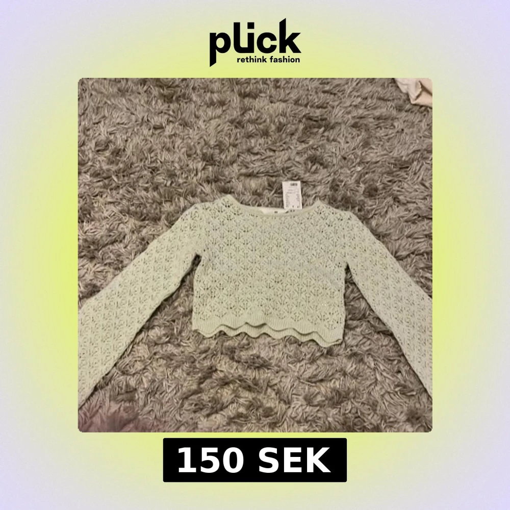 Säljer en ljusgrön croppad stickad tröja från H&M. Tröjan har lång ärm, vågig nederkant och ett fint spetsliknande mönster. Perfekt för dig som gillar en söt och trendig stil!