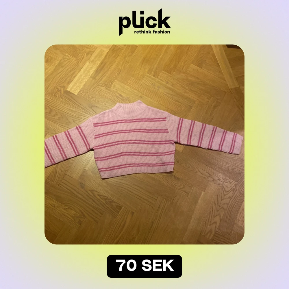 Säljer en superfin rosa stickad tröja från H&M med mörkrosa ränder. Den är croppad och har en mysig ribbad krage. Perfekt för höst och vår! Passar både till vardags och lite festligare tillfällen. 🩷