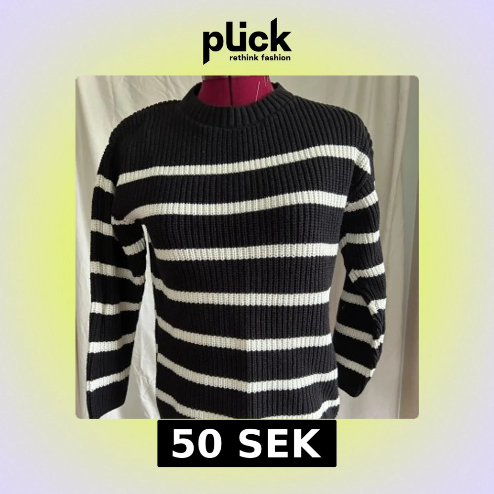 Säljer en svart och vit randig stickad tröja från H&M. Tröjan har breda horisontella ränder, rund halsringning och är långärmad. Materialet är en mix av bomull och akryl vilket gör den både mjuk och varm. Perfekt för dig som gillar klassisk stil med en twist.