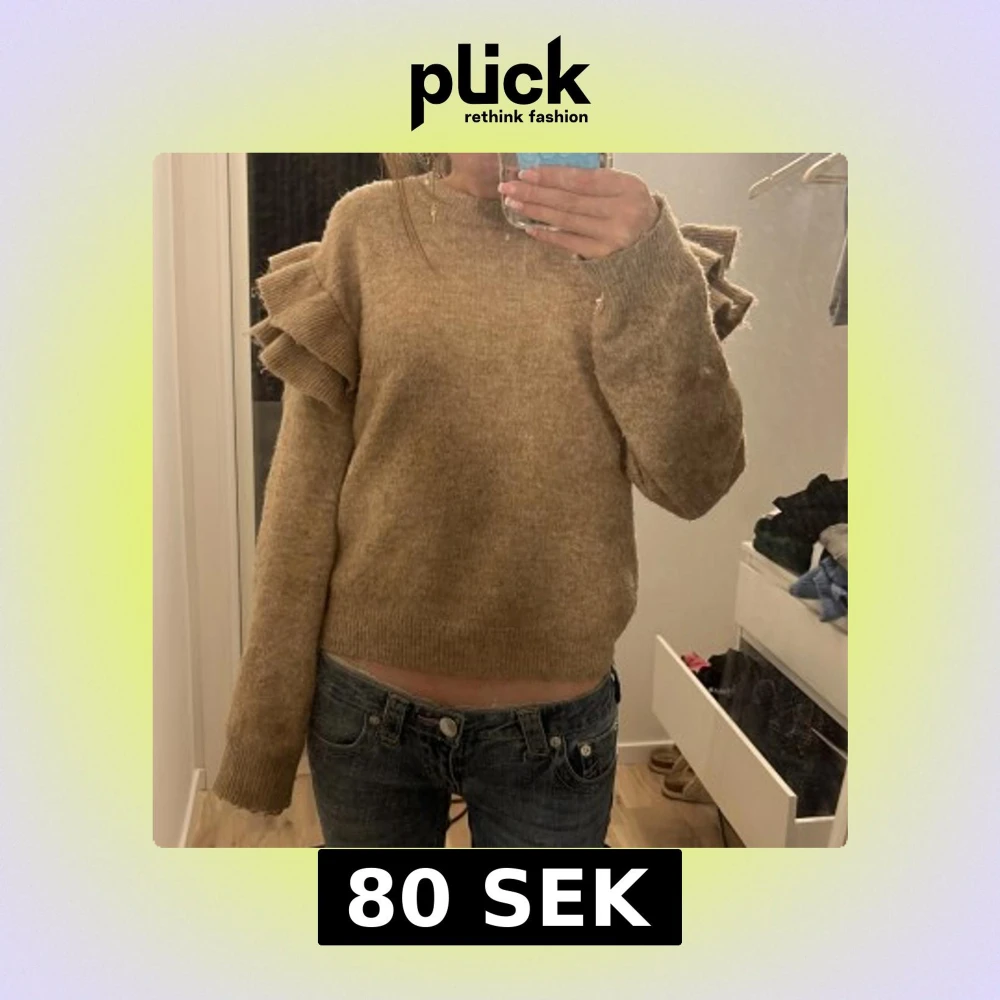 Säljer en beige stickad tröja med långa ärmar och volangdetaljer på axlarna. Tröjan har en rund halsringning och är mjuk och skön. Perfekt för dig som gillar unika detaljer och en mysig stil.