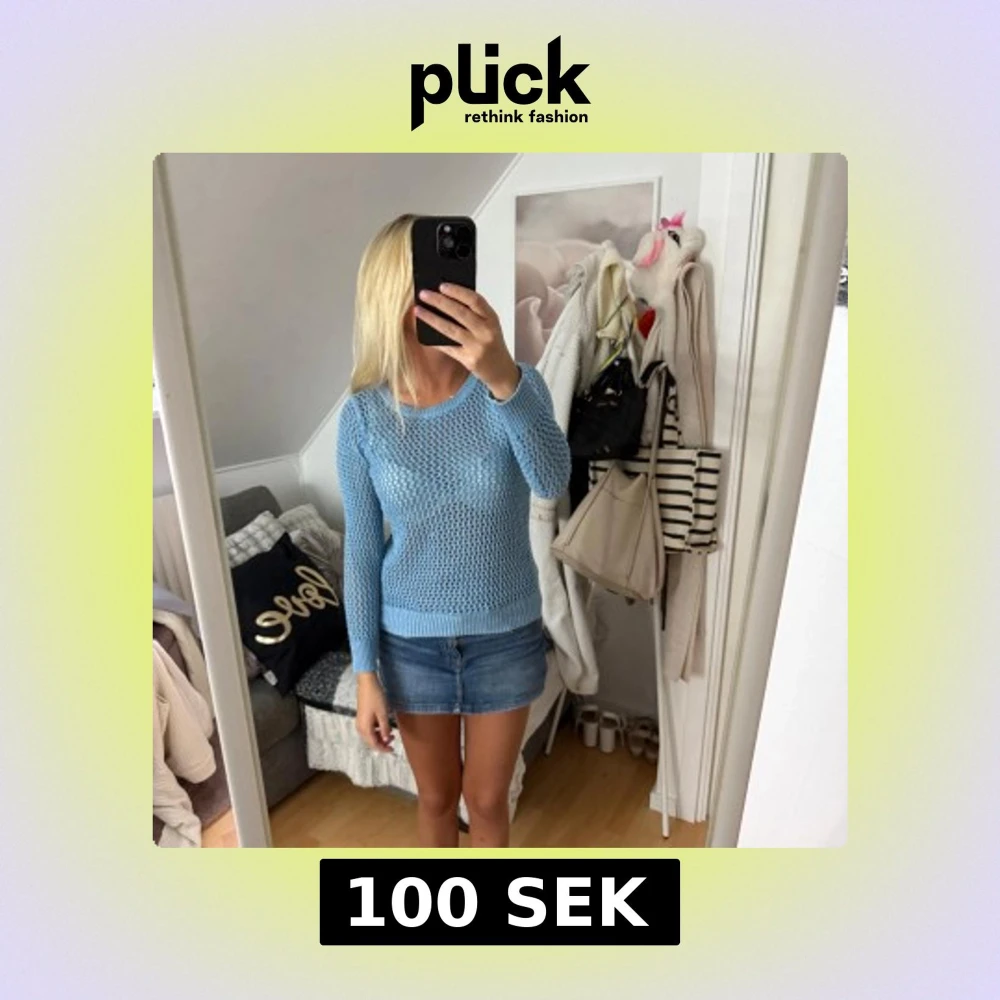 Säljer en ljusblå stickad tröja från H&M med coolt hålmönster. Tröjan har rund halsringning och långa ärmar. Perfekt att slänga över ett linne eller bikini för en chill look. Materialet är mjukt och luftigt, vilket gör den skön att bära under varmare dagar.