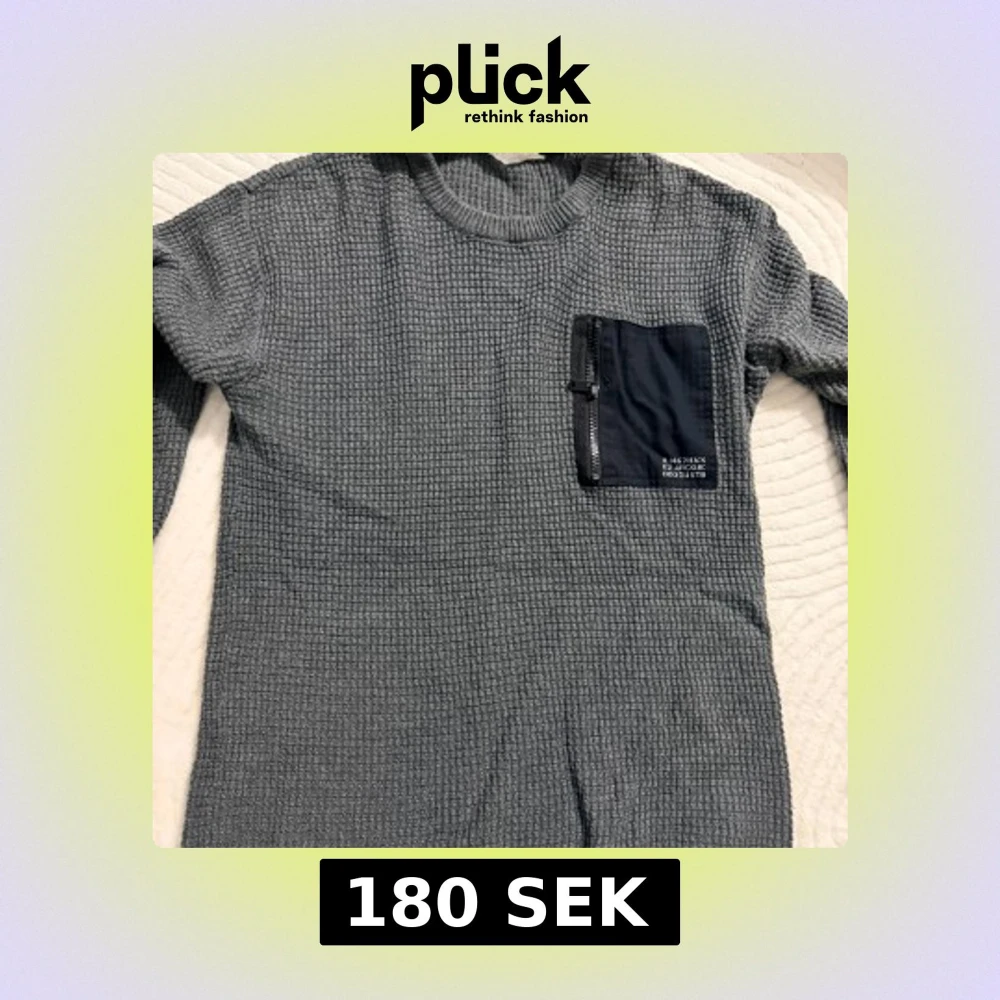 Grå stickad tröja från H&M med lång ärm och cool svart bröstficka med dragkedja och tryck. Tröjan har ett rutigt stickat mönster och rund halsringning. Perfekt för dig som gillar en avslappnad men ändå stilren look.