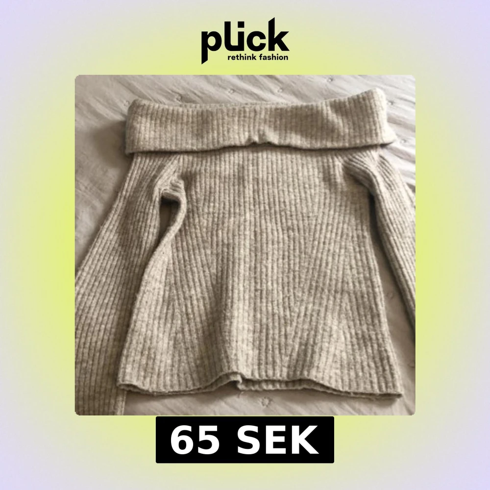 Säljer en beige stickad tröja med ribbad struktur och bred offshoulder-krage. Tröjan har långärmade ärmar och är gjord i ett mjukt material som passar perfekt för kyliga dagar. Enkel och stilren design som är lätt att matcha med olika outfits.