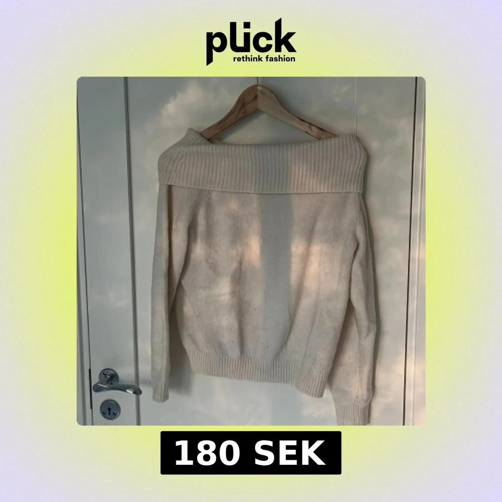 Säljer en krämvit stickad offshoulder-tröja från H&M i storlek 164. Tröjan har bred ribbad kant upptill och vid ärmslut, samt lång ärm.