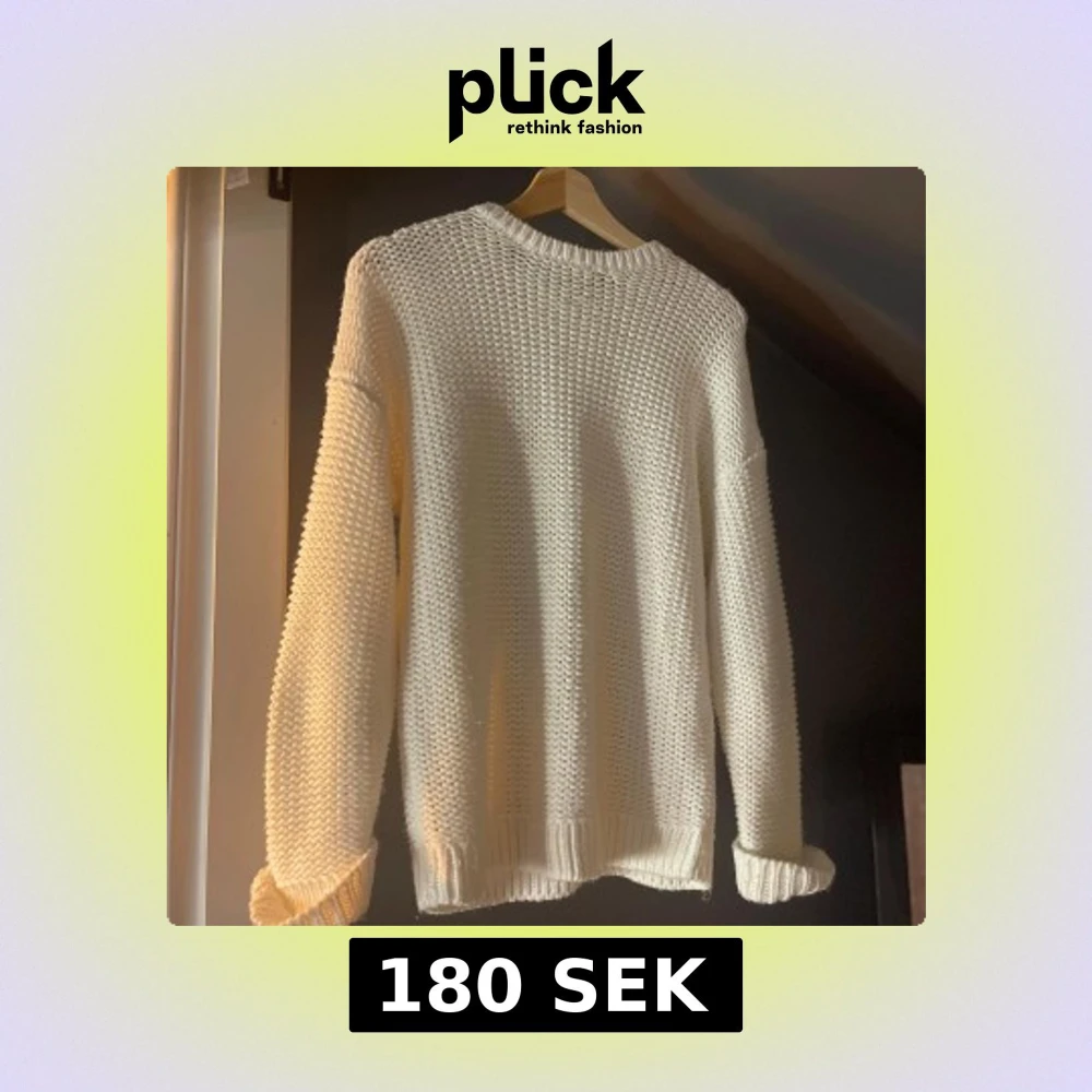 Säljer en vit chunky stickad tröja med grov struktur och ribbade muddar vid ärmslut och nederkant. Tröjan har en avslappnad passform och långa ärmar, perfekt för lager-på-lager under kyliga dagar. Finns en tråd som gått upp men går säkert bra att bara klippa av