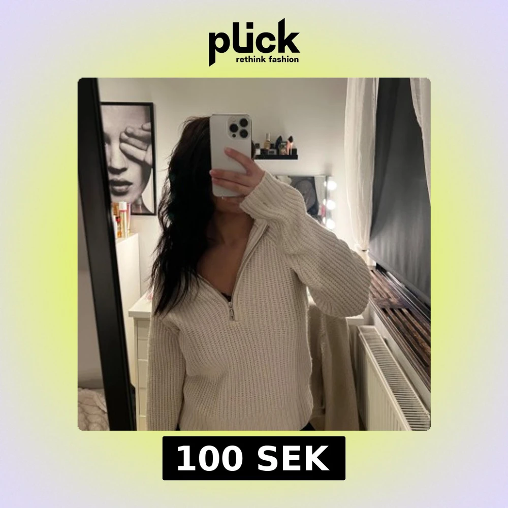 Vit/beige stickad tröja med half zip-dragkedja och lång ärm. Finns en fläck på armslutet. Inget som stört mig, men kan nog lätt tvättas bort.