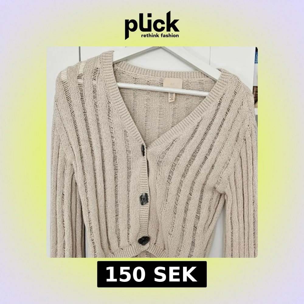 Säljer en beige croppad kofta från H&M med ribbat stickat material och stora knappar framtill. Tröjan har lång ärm och en avslappnad passform, perfekt att slänga över en topp.