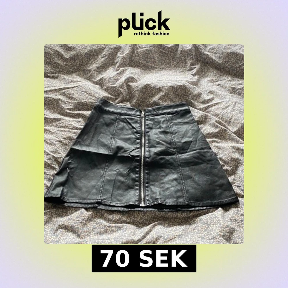 Snygg svart kort kjol i skinnimitation med markerade sömmar och dragkedja framtill. Kjolen har en lätt utsvängd form som ger en cool vibe och passar perfekt till en stickad tröja eller en tuff jacka. Perfekt för dig som gillar en edgy stil.