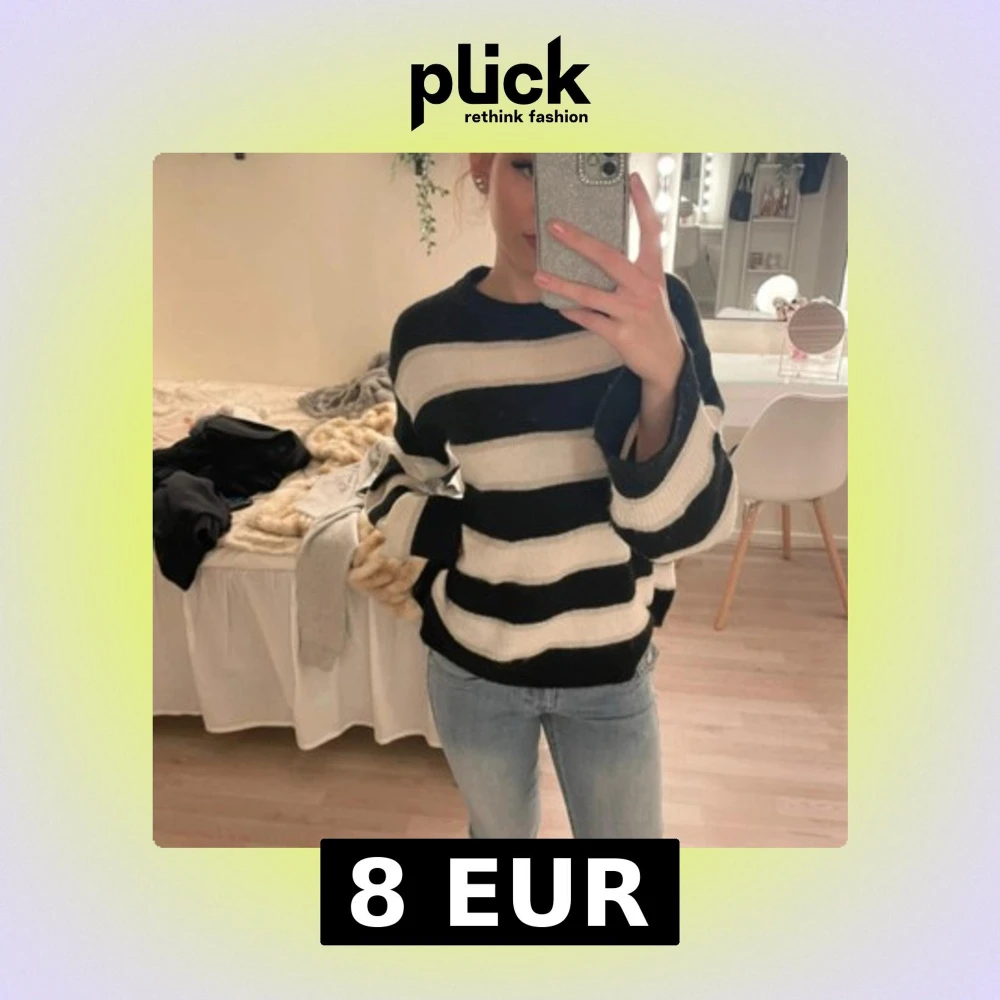 Säljer en oversized stickad tröja med breda svarta och vita ränder. Tröjan har rund halsringning och långa ärmar med avslappnad passform. Perfekt för dig som gillar en chill och trendig stil.
