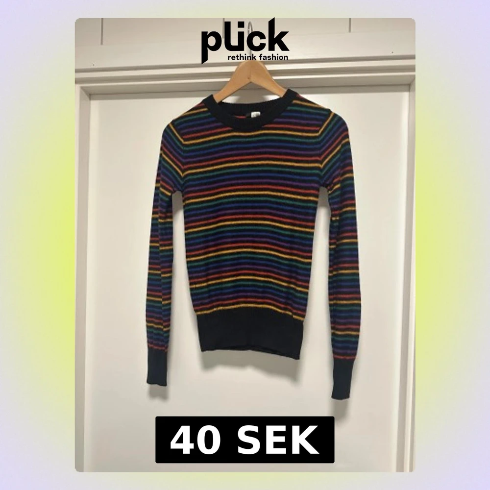 Snygg stickad tröja med färgglada ränder i lila, blått, grönt, gult, orange och rött mot svart bakgrund. Tröjan har rund hals, ribbade muddar och lång ärm. Perfekt för dig som gillar färg och vill sticka ut lite extra.