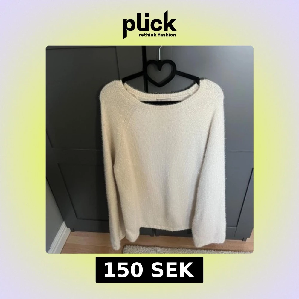 Säljer en vit stickad tröja med diskret glittrigt garn. Tröjan har rund halsringning och långa ärmar. Perfekt för dig som vill ha en enkel men ändå lite extra tröja till garderoben.