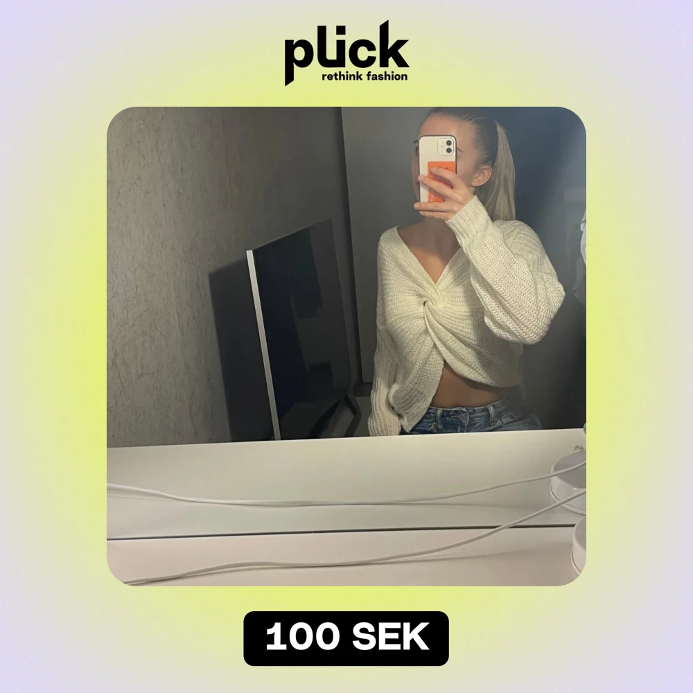 Säljer en superfin vit stickad tröja med knyt framtill. Den är croppad och har långa ärmar, perfekt för både höst och vår. Tröjan är i bra skick och passar perfekt till ett par jeans för en avslappnad look.