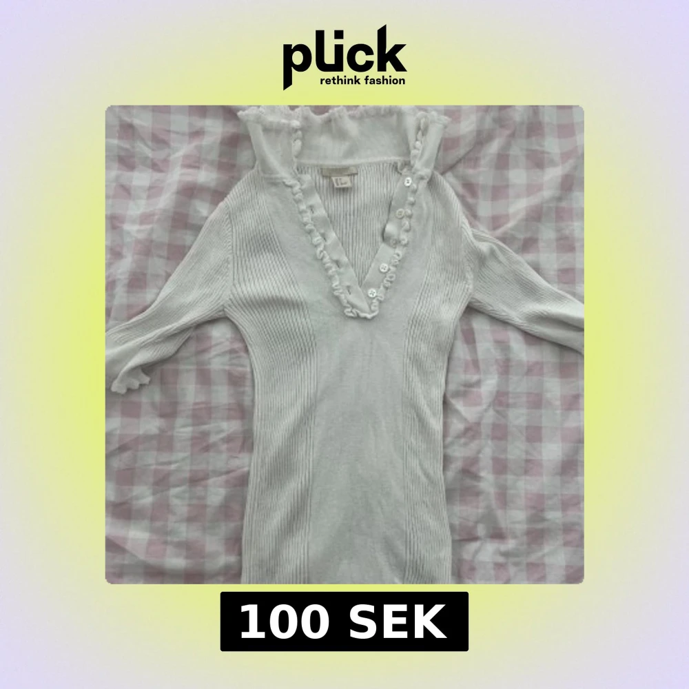 Supersöt vit stickad tröja från H&M med ribbad struktur, v-ringning med volangkant och knappar framtill. Tröjan har långa ärmar och en feminin, figurnära passform. Perfekt för dig som gillar romantiska detaljer och vill ha en stilren look.