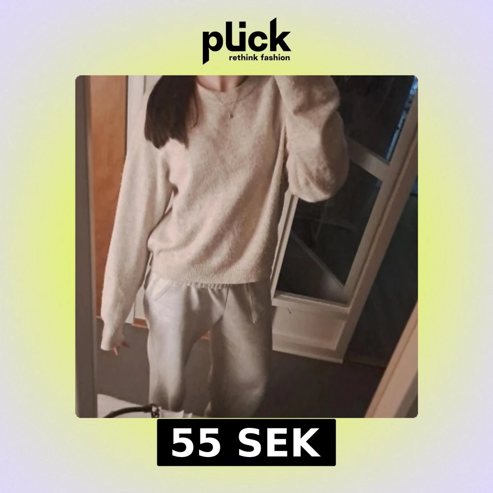 Mysig beige stickad tröja med långa ärmar och ribbade muddar. Perfekt för kyligare dagar.