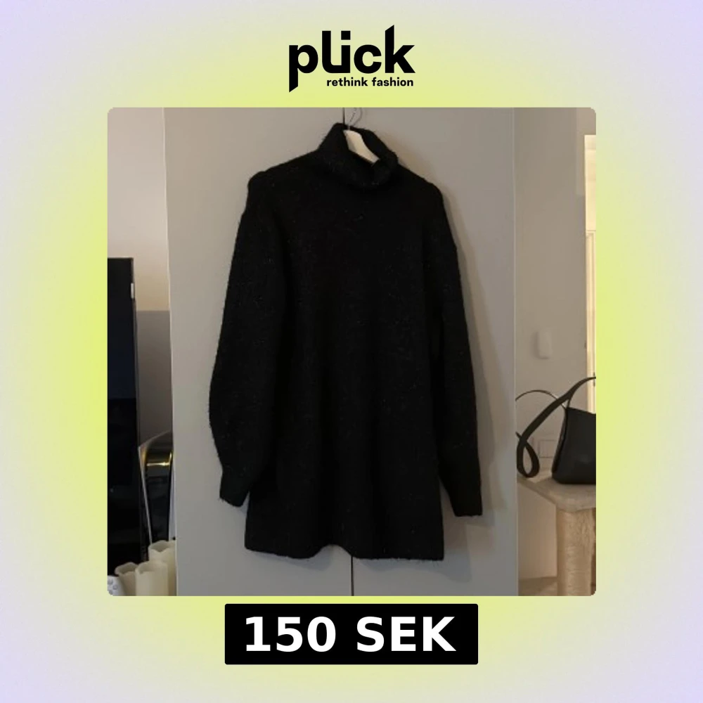 Säljer en svart glittrig polotröja från H&M. Tröjan har lång ärm och är stickad med ett glansigt garn som ger en festlig känsla. Perfekt för dig som vill sticka ut lite extra. Polokrage och normal passform. Den kan användas som klänning då den är lite längre.