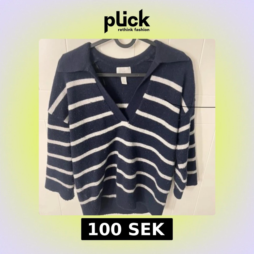 Mysig marinblå stickad tröja från H&M med vita horisontella ränder. Tröjan har v-ringning, krage och långa ärmar. Perfekt för lager-på-lager och passar till många olika stilar.