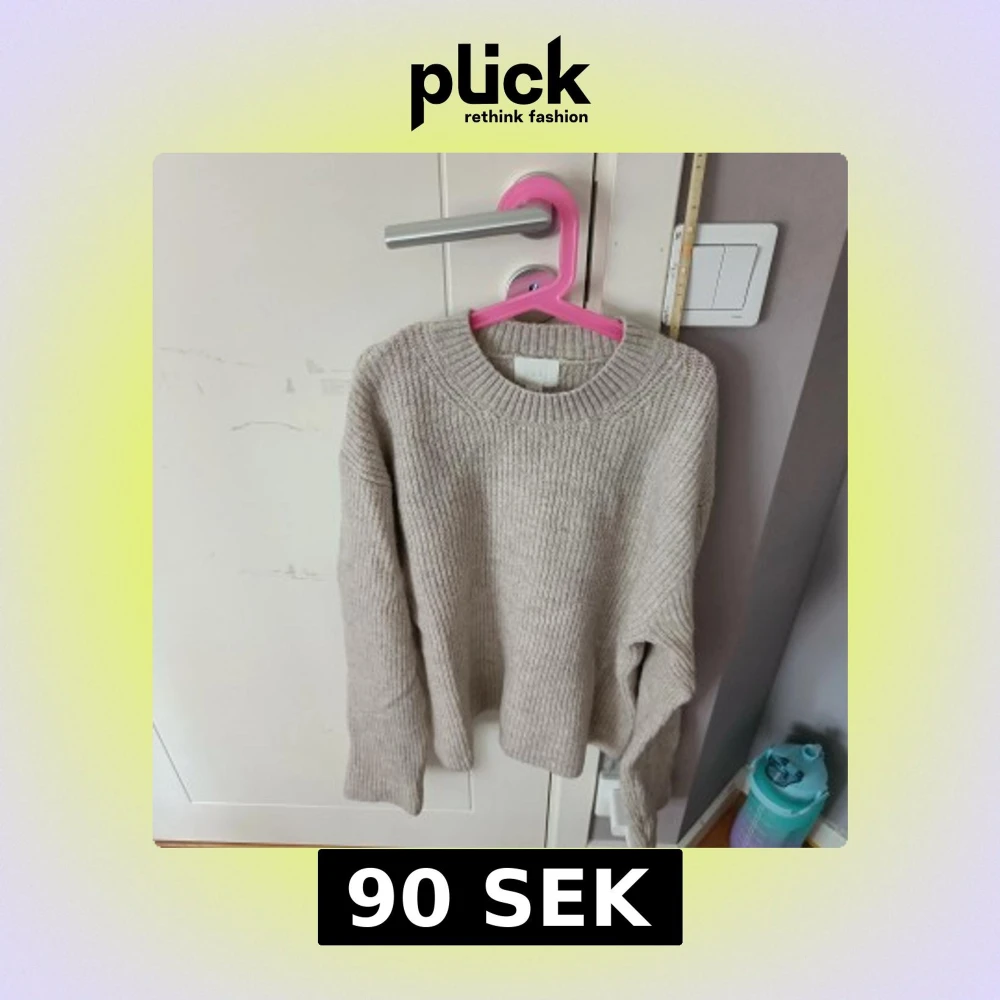 Säljer en mysig beige stickad tröja med rund halsringning. Tröjan har långa ärmar och en enkel design som passar perfekt för kyligare dagar. Perfekt för en avslappnad stil.