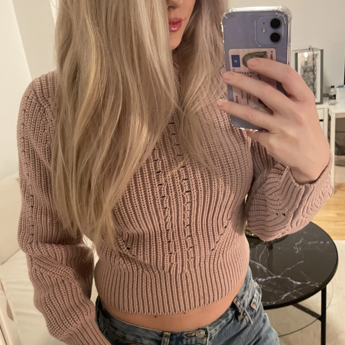 Fin stickad tröja som sitter lite tajtare på magen och lite lösare upptill och i ärmarna. Gammelrosa i färgen.