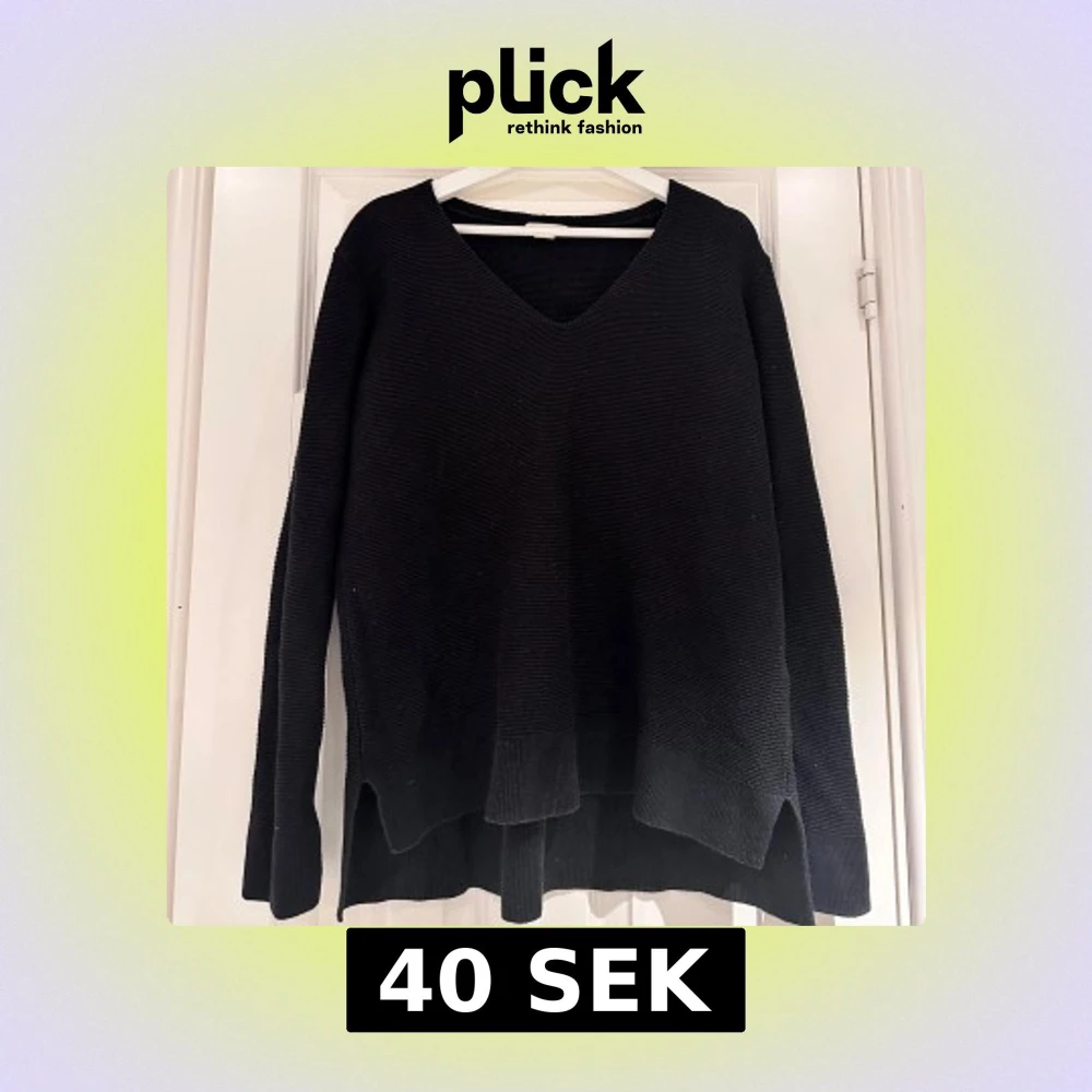 Svart stickad tröja från H&M storlek L! V-ringad och slits vid ärmslut och nertill på båda sidor💕 I gott skick!