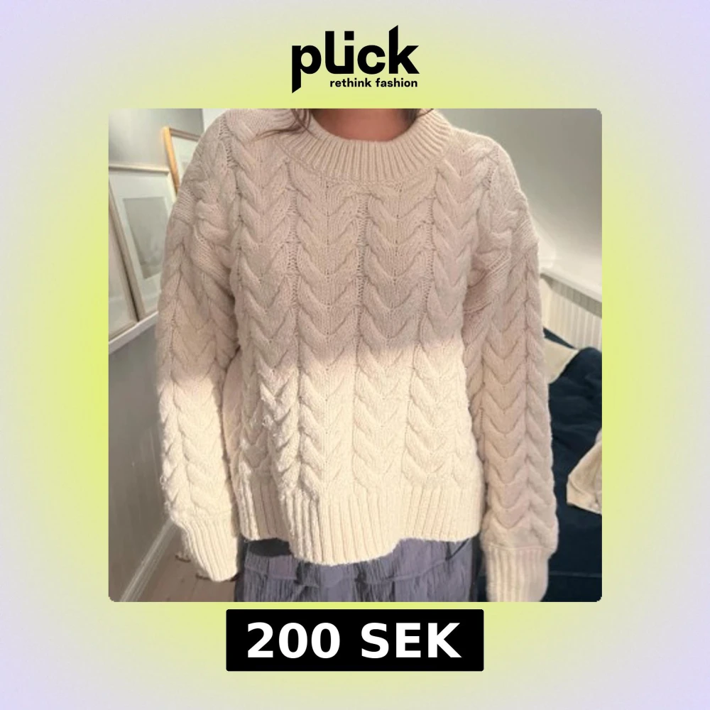 Säljer en vit stickad tröja med grovt kabelmönster och rund hals. Tröjan har långärmade ärmar och breda ribbade muddar vid hals, ärmslut och nederkant. Perfekt för dig som gillar mysiga och chunky tröjor med lite oversized känsla.