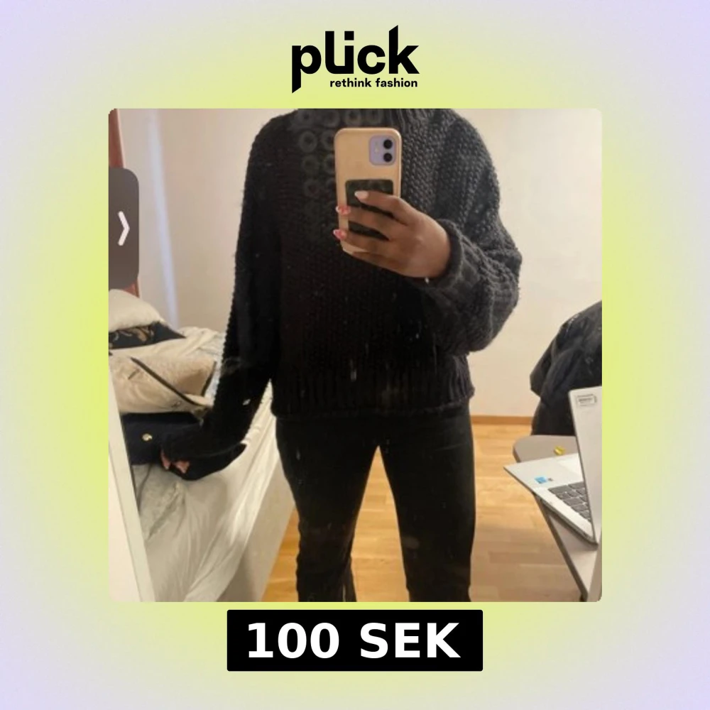 Mysig svart stickad polotröja med oversized passform och grovstickat mönster. Tröjan har långa ärmar och hög krage som ger en cool och avslappnad vibe. Perfekt för kalla dagar när du vill vara både varm och snygg.