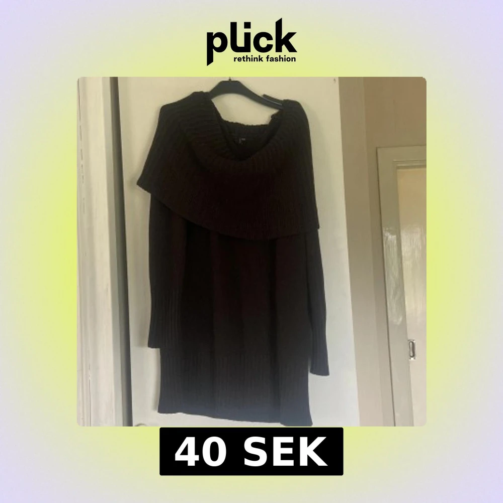 Mysig svart stickad klänning/ lång tröja från H&M med bred, ribbad krage som kan bäras offshoulder. Klänningen/långtröjan är kort och har långa ärmar samt ribbade detaljer vid ärmslut och nederkant. Perfekt för kalla dagar när du vill vara både bekväm och snygg.