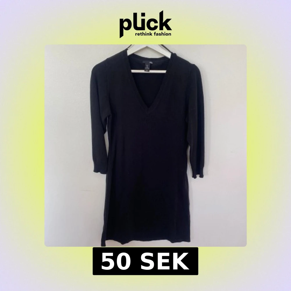 En svart stickad klänning från H&M i storlek L. Klänningen har v-ringning, trekvartsärm och en rak, enkel passform. Använd fåtal gånger.