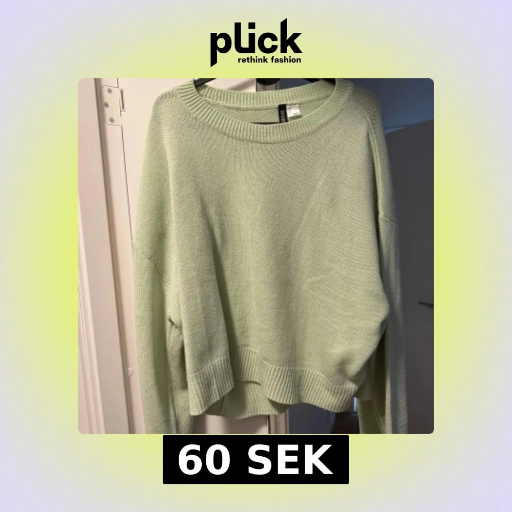 Säljer en ljusgrön stickad tröja från H&M. Tröjan har en rund halsringning och ribbade kanter vid ärmslut och nederkant. Nästintill oanvänd