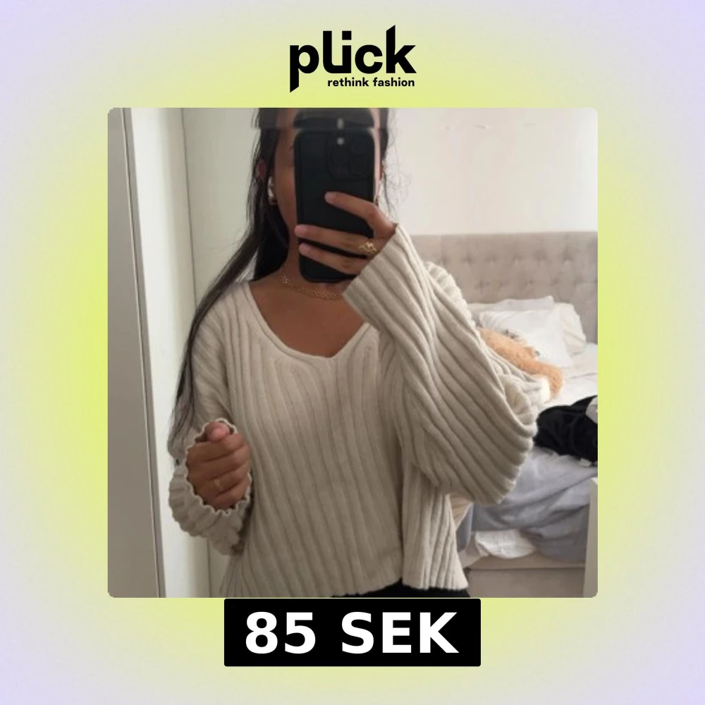 Säljer en supermysig beige stickad tröja med breda ribbade ränder och v-ringad hals. Tröjan har långa ärmar med lite loose passform och är perfekt för att chilla eller hänga med vänner. Passar dig som gillar enkel och stilren vibe. Storlek L men passar M