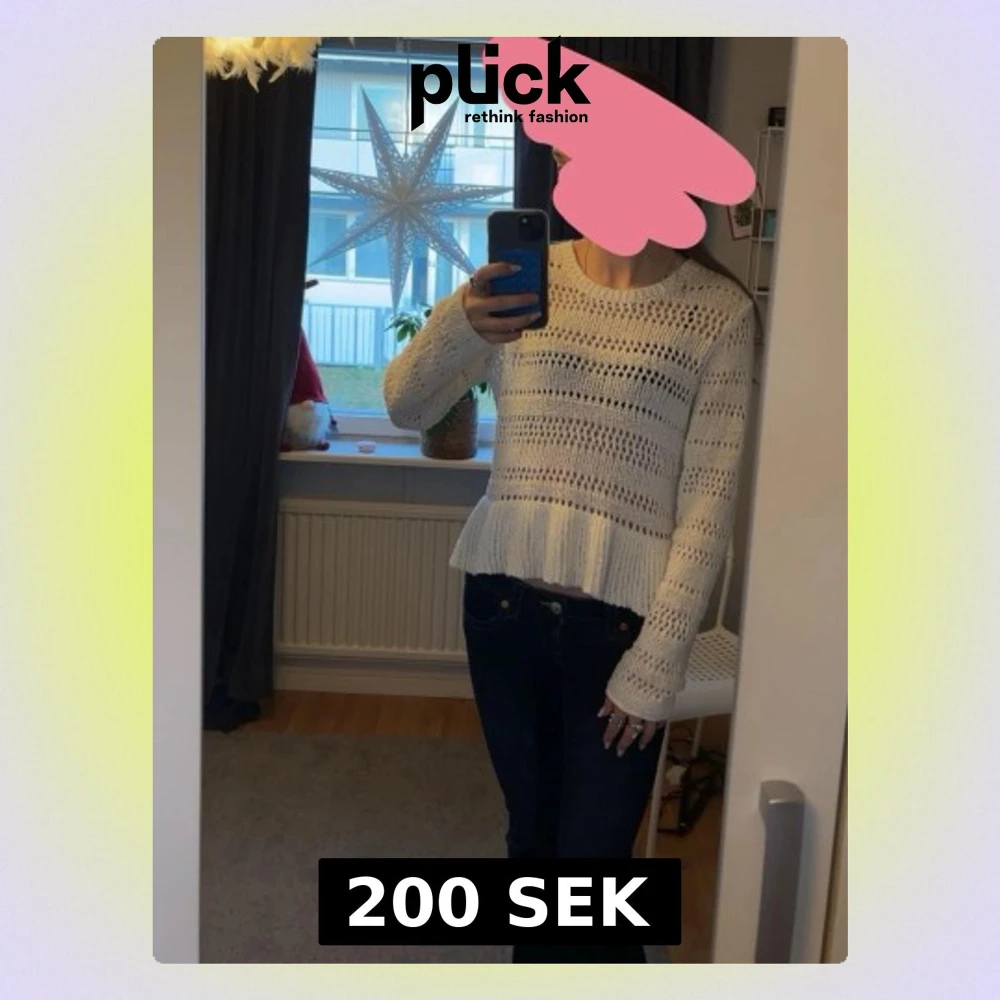 Säljer en söt vit stickad tröja med hålmönster och volangkant nedtill. Tröjan har lång ärm och rund halsringning, perfekt för dig som gillar en feminin och trendig stil. Passar lika bra till jeans som till kjol.