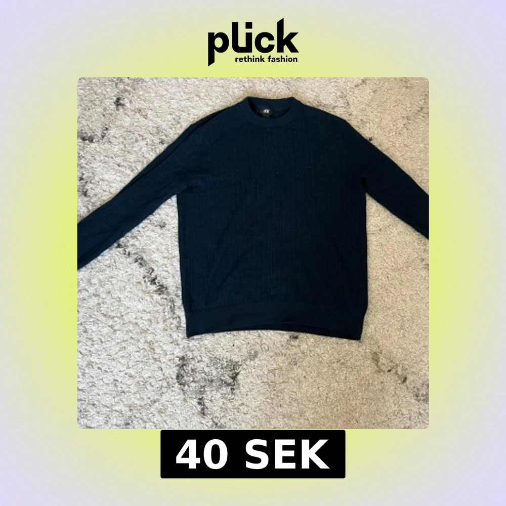 Mörkblå stickad tröja från H&M i storlek M. Tröjan har rund halsringning, ribbade muddar och ett diskret stickat mönster. Perfekt för lager-på-lager och passar till jeans eller chinos.