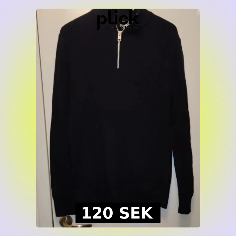 Svart stickad tröja från H&M med slim fit-passning och half zip-dragkedja i silver. Tröjan har hög krage och långa ärmar, perfekt för kyliga dagar. Materialet är mjukt och ribbat vilket ger en snygg och modern look.