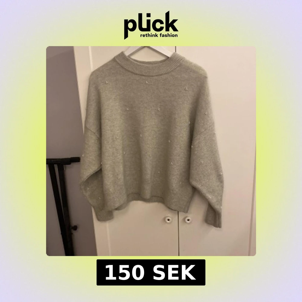Säljer en mysig grå stickad tröja från H&M med pärldetaljer. Tröjan har en normal passform och långa ärmar. Perfekt för kyliga dagar!