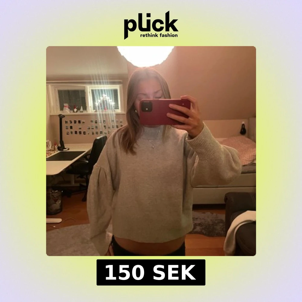 Säljer en mysig grå stickad tröja med långa ärmar. Perfekt för kyligare dagar och ger en avslappnad look.