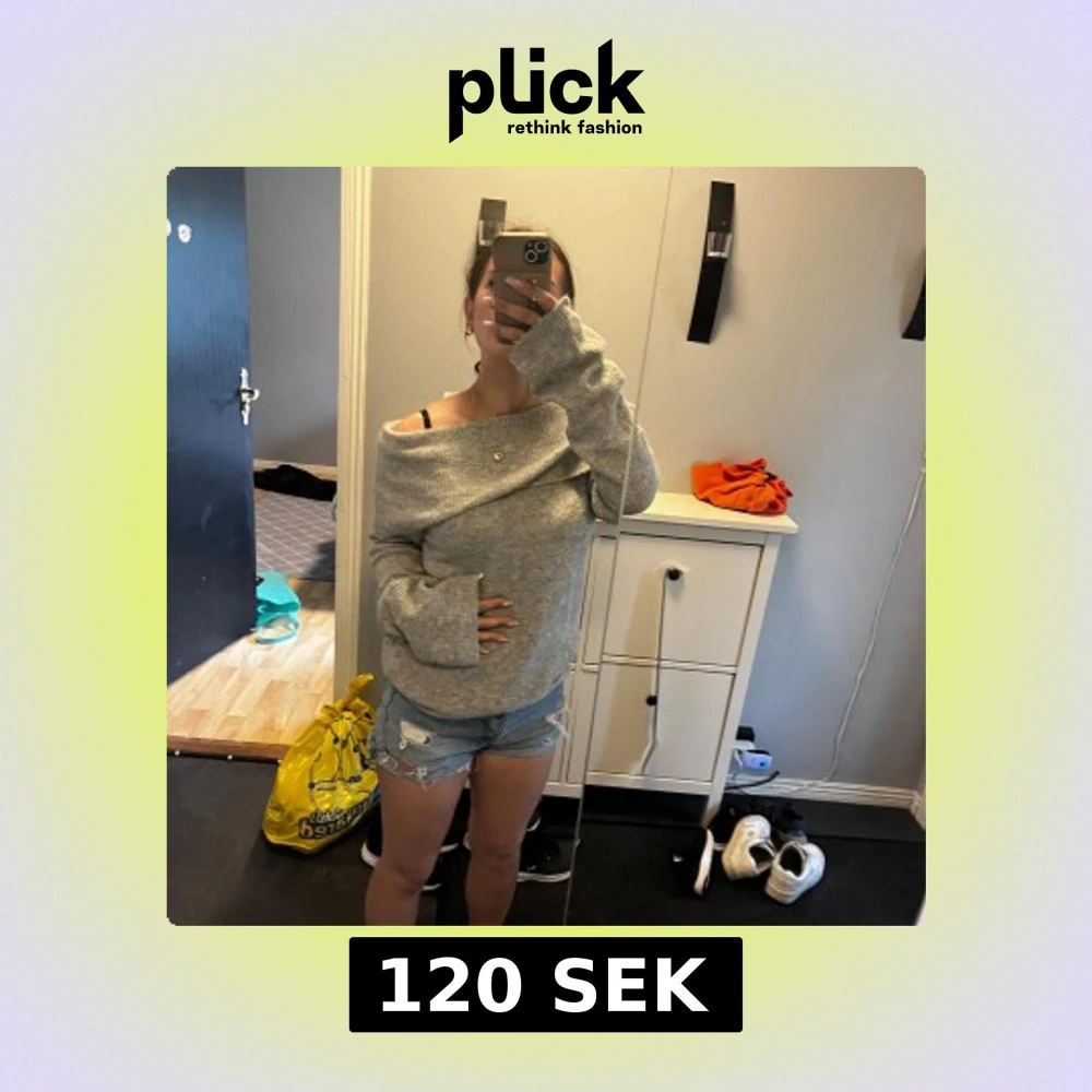Supermysig ljusgrå stickad tröja med offshoulder-design och långa ärmar. Tröjan har en ribbad struktur. Den är ifrån HM storlek M☺️