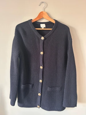 Säljer en mörkblå stickad kofta från H&M i storlek M. Koftan har grov ribbstickning, snygga guldfärgade knappar framtill och två fickor. Perfekt för lager-på-lager och chill stil under höst och vinter.