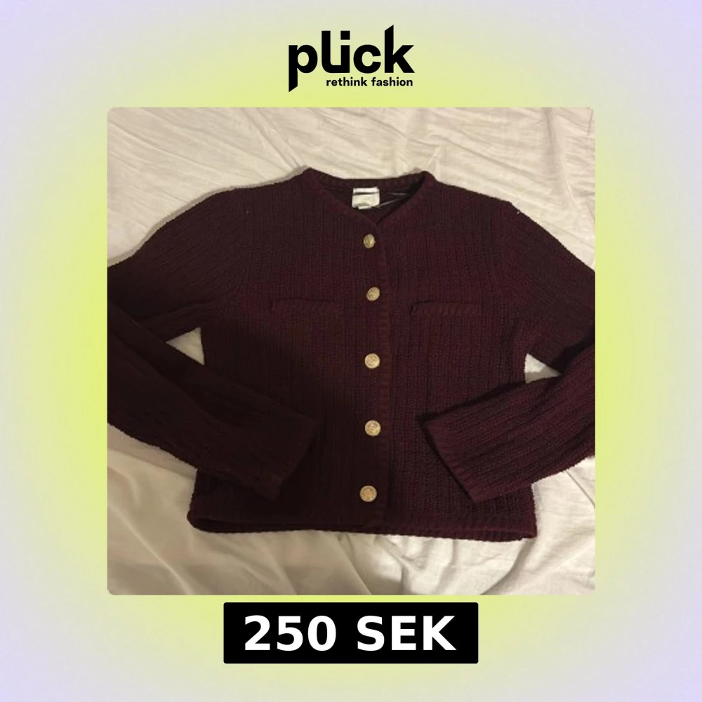 Mysig vinröd stickad kofta från H&M med snygga guldknappar framtill och två dekorativa fickor på bröstet. Koftan har långärmad passform och är perfekt för lager-på-lager under kyliga dagar.