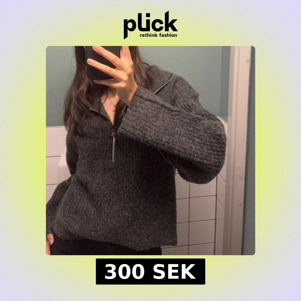 Säljer en mysig mörkgrå stickad tröja med dragkedja vid halsen. Perfekt för kyliga dagar och enkel att matcha med olika outfits. Tröjan har långa ärmar och en avslappnad passform.