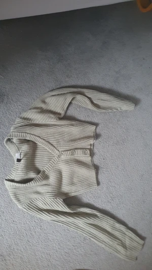 Vit croppad stickad tröja - Säljer en vit croppad stickad tröja med lång ärm och bred mudd vid midjan. Tröjan har en enkel och clean design, perfekt att matcha med jeans eller kjol. Materialet är mjukt och bekvämt, och modellen är loose för en avslappnad look. Storlek xs men mer som s