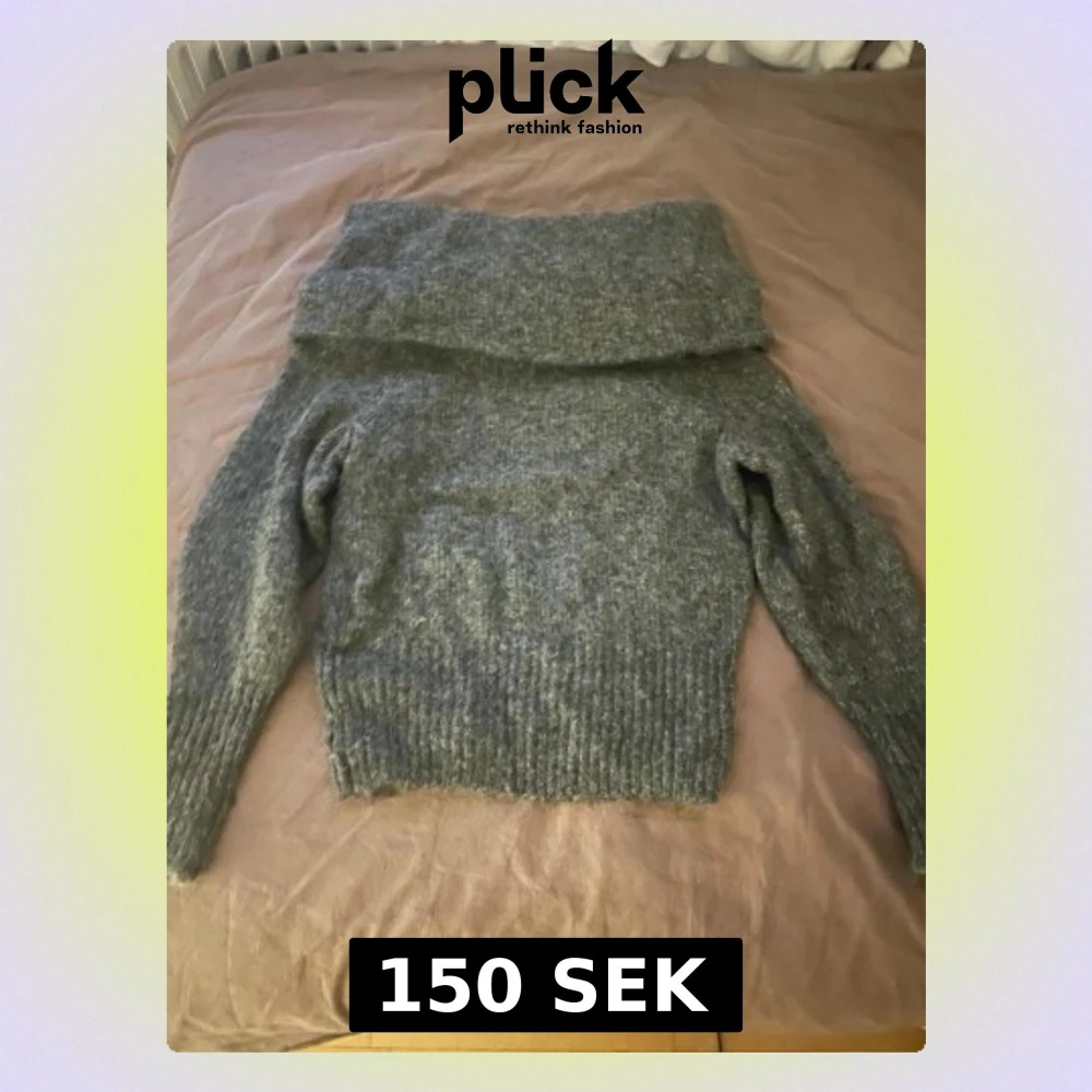 Mysig grå stickad off sholder från H&M i storlek S. Tröjan har långa ärmar och ribbade muddar vid ärmslut och nederkant. Perfekt för kyliga dagar och enkel att styla med jeans eller kjol.