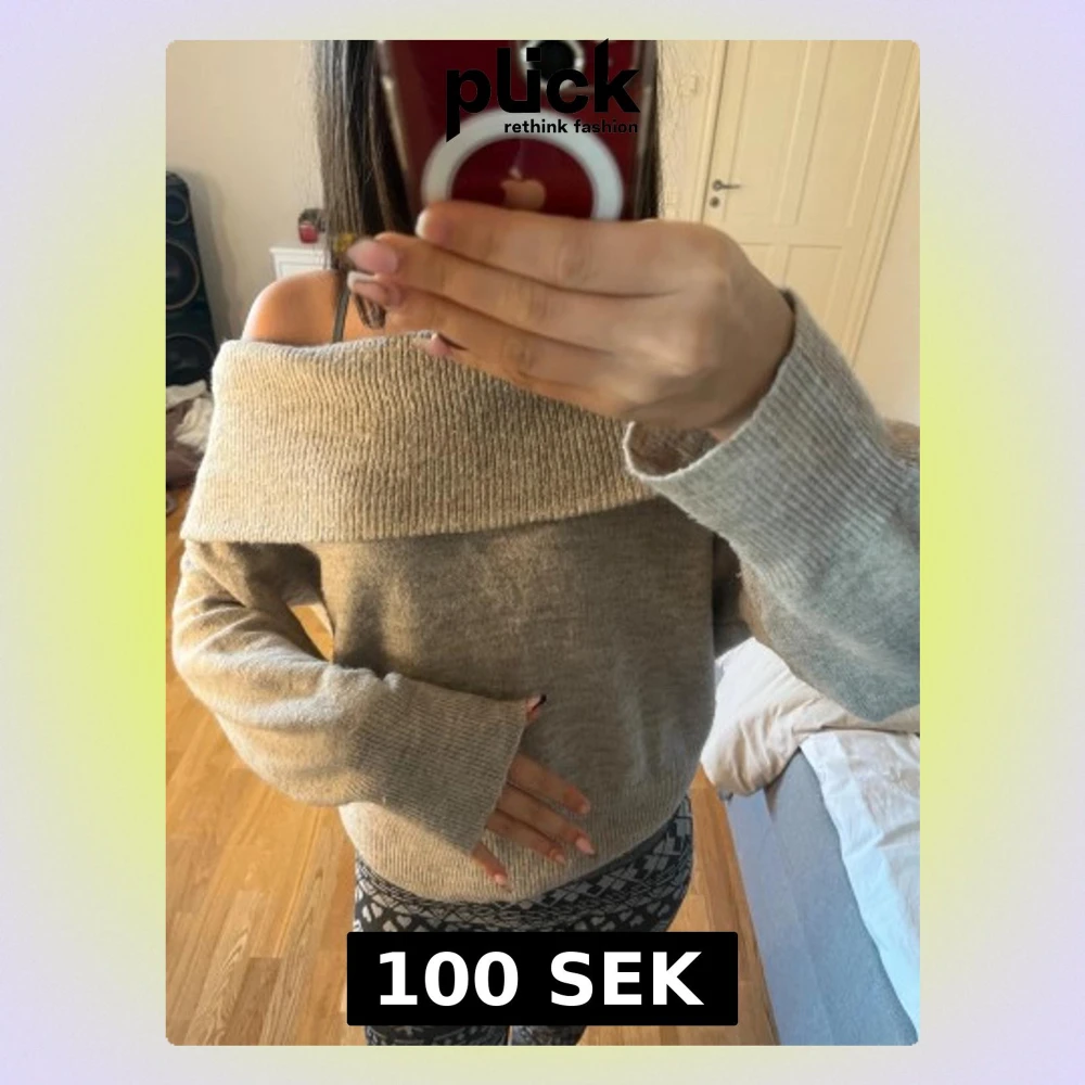 Supermysig beige stickad tröja från H&M med bred offshoulder-krage. Tröjan har långärmade ärmar och en passform som ger en chill vibe. Perfekt att styla med jeans eller leggings för en snygg look.