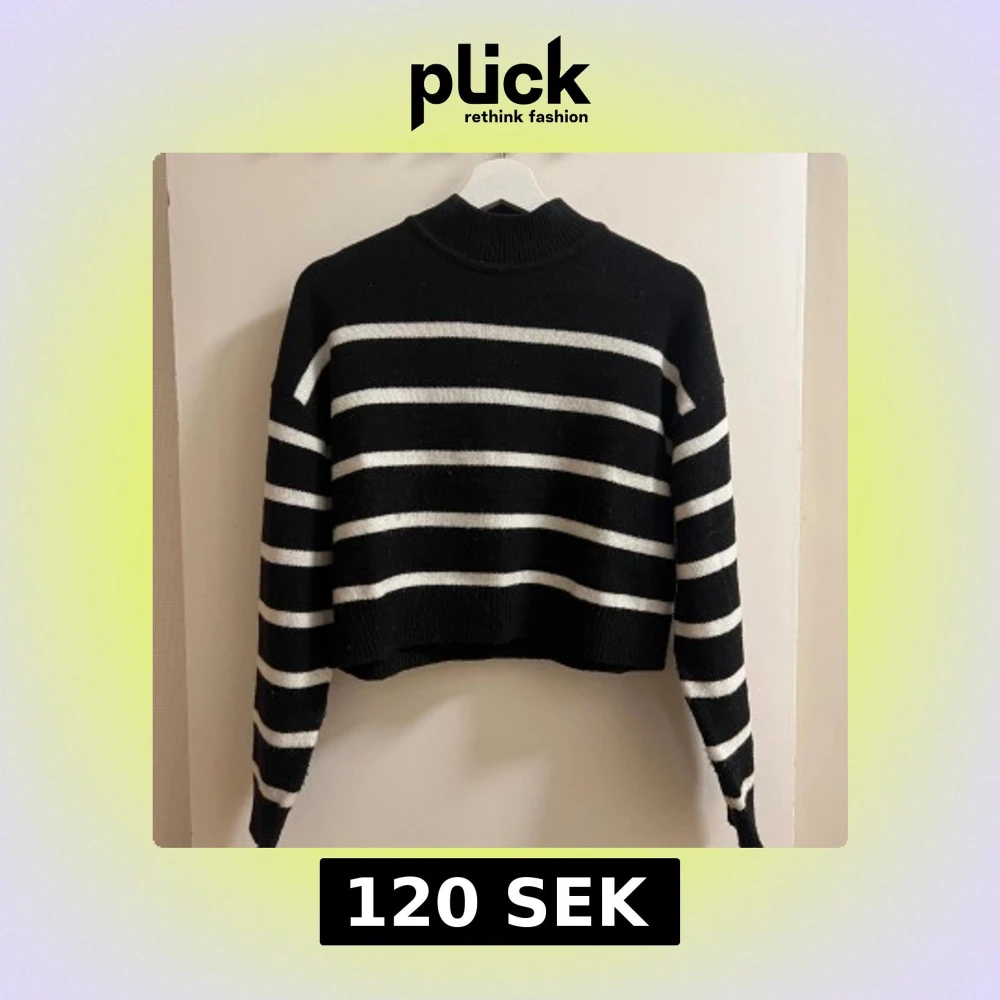Säljer en snygg svart och vit randig stickad tröja med långa ärmar. Tröjan har en hög krage och är perfekt för kyligare dagar. Den har en croppad passform som ger en modern look.