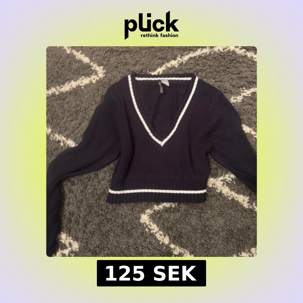 Snygg mörkblå croppad stickad tröja från H&M Divided med vita ränder vid v-ringningen och nederkanten. Tröjan har lång ärm och ribbade detaljer, perfekt för lager-på-lager och en sportig vibe.