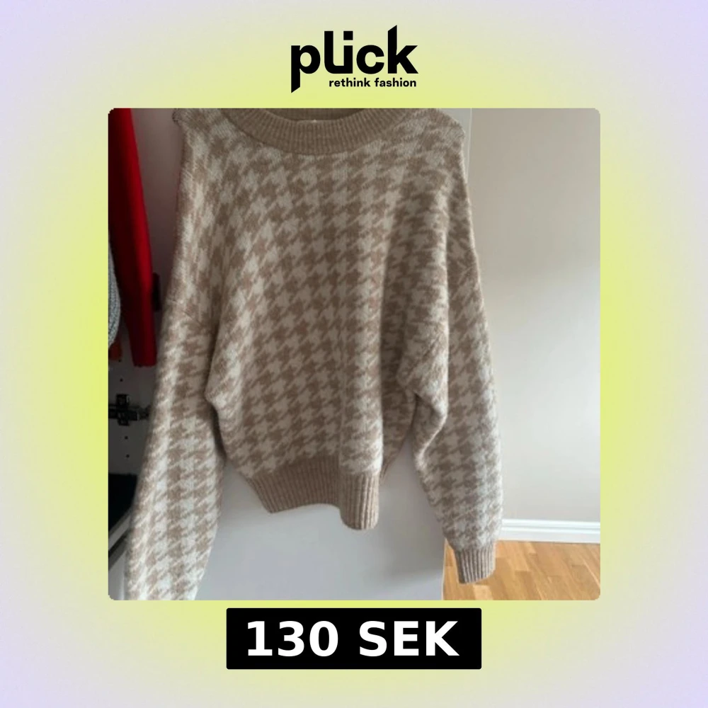 Säljer en mysig beige och vit stickad tröja med ett klassiskt hundtandsmönster. Tröjan har långa ärmar och ribbade muddar vid ärmslut och nederkant. Perfekt för kyliga dagar!