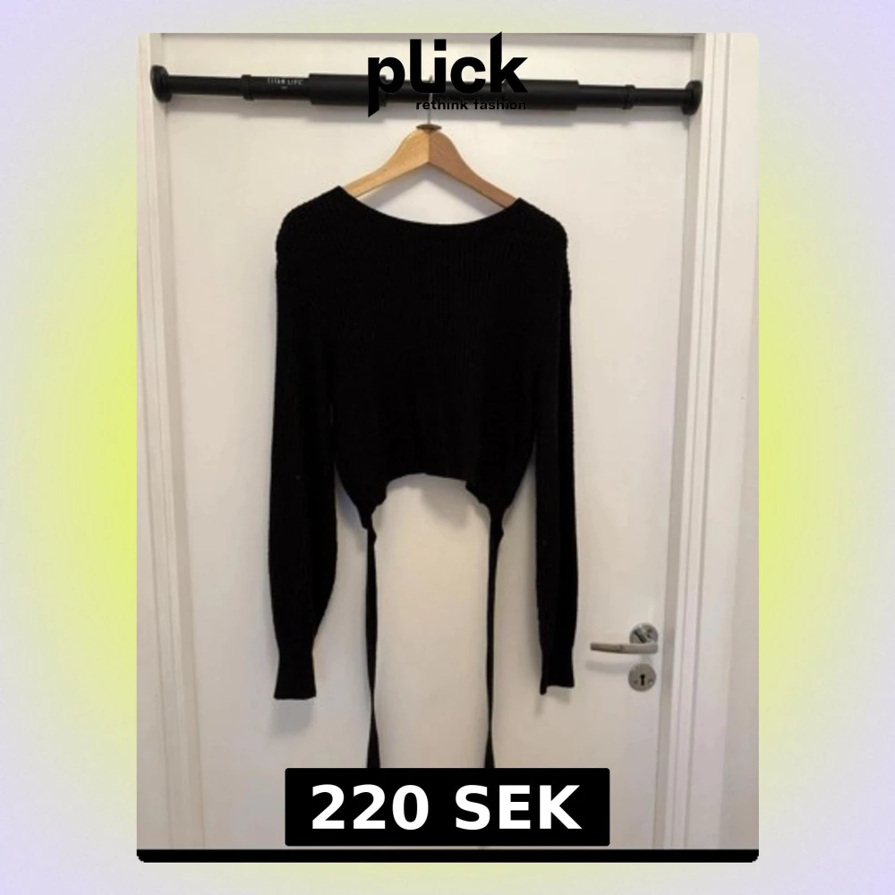 Säljer en svart croppad stickad tröja med långa ärmar och snygg knytning baktill. Tröjan har en rund halsringning och är gjord i ett grovstickat material som känns mjukt och skönt. Perfekt för dig som gillar trendiga detaljer och vill ha en cool look.