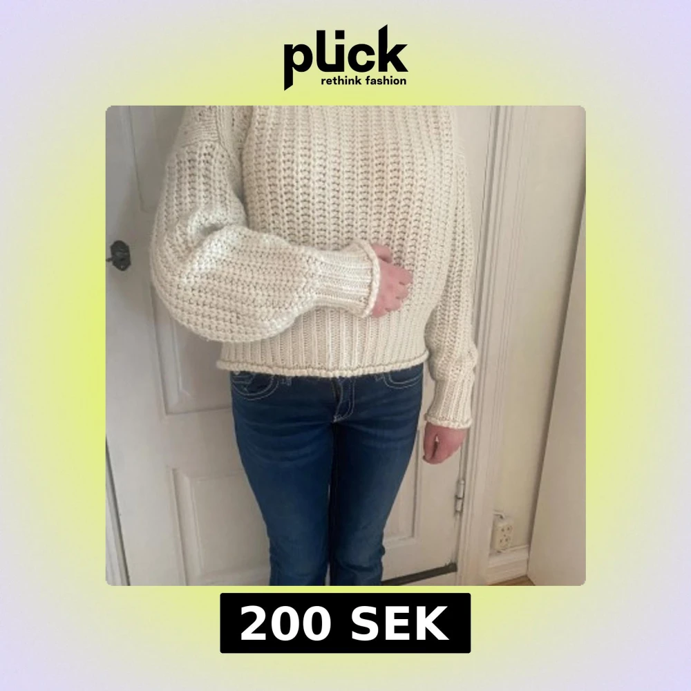 Säljer en chunky vit stickad tröja med breda ribbade muddar och avslappnad passform. Tröjan har långa ärmar och är perfekt för kyligare dagar. Enkel att matcha med jeans eller kjol för en stilren look.